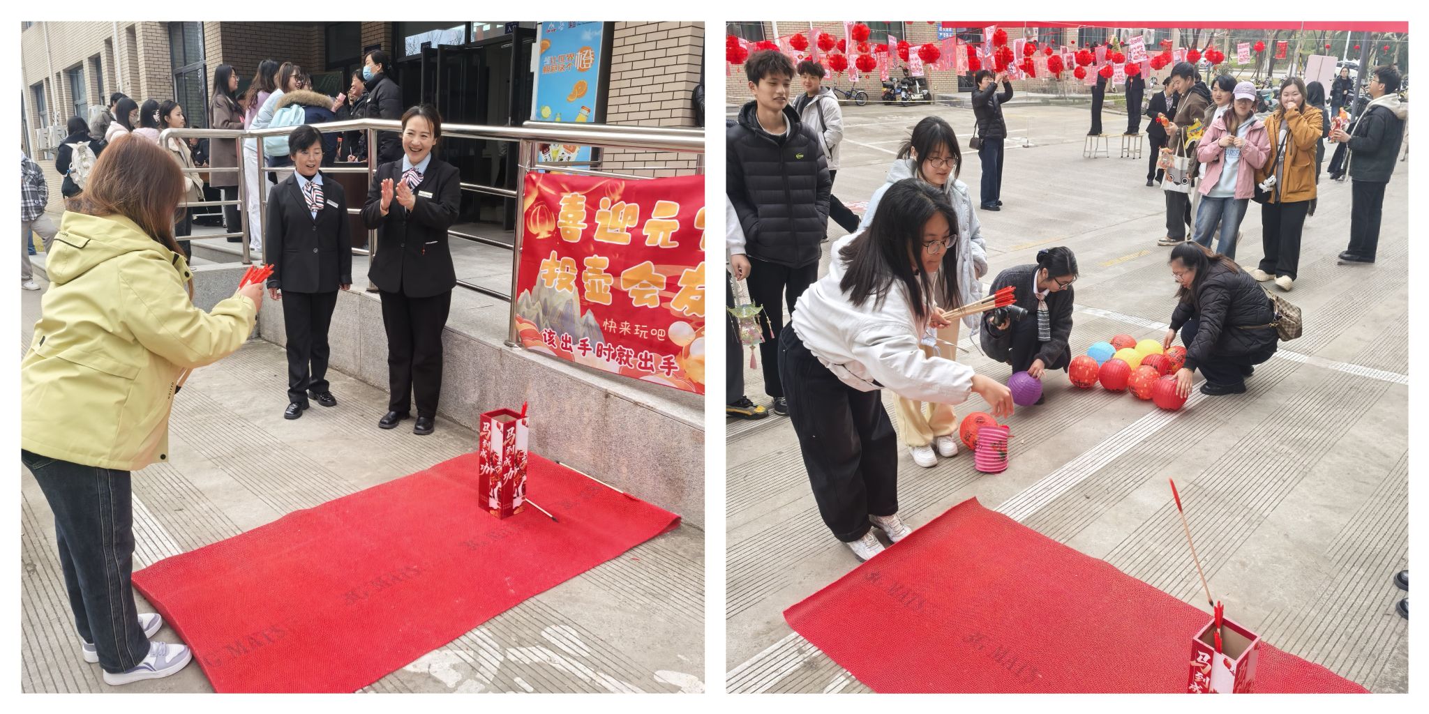 活动以传统元宵节民俗为载体,巧妙融入宿舍安全教育、后勤服务知识普及等内容,精心设计“平安灯谜会”“喜乐投壶赛”“趣味套圈乐”三大互动活动。灯谜区内,灯笼摇曳,谜条轻舞,民俗谜题引人遐思,安全知识化作巧问。师生凝神思索、会心一笑,在解谜中收获知识,在互动中感受守护。