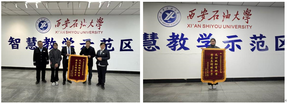 校园平安保障体系的顺畅运行,离不开快速有效的应急响应与妥善处置。近日,王同学在教学B楼207卫生间内突发不适晕倒,保洁员黄巧利第一时间发现,现场陪护并拨打120,为救治争取了宝贵时间;巡视员张养民接报后迅速赶到现场,协调师生、跟进就医流程,全程保障处置及时高效。在后勤团队协同配合下,该生得到有效救治。康复后,王同学送来锦旗,对我中心工作人员的专业与尽责表达诚挚谢意。