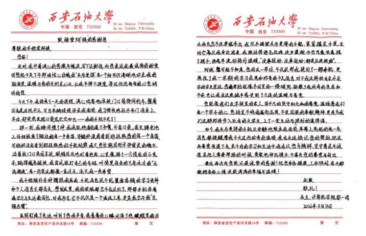 郭同学不慎丢失存有重要资料和个人信息的手机,被计算机院值班员乔稳花阿姨拾到并妥善保管。她及时联系归还,郭同学在感谢信中写道:“您的帮助就像冬日里的暖阳,驱散了我所有焦虑,让我在这座城市感受到久违的温暖。”