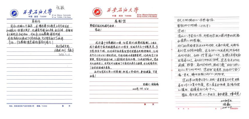 近日,学校后勤处物业管理服务中心陆续收到在校学子送来的致谢锦旗与亲笔感谢信。字里行间,满载真挚的认可与深切的谢意,生动诠释了后勤服务队伍“服务育人、用心守护”的初心使命,让校园温情与向善力量不断传递。